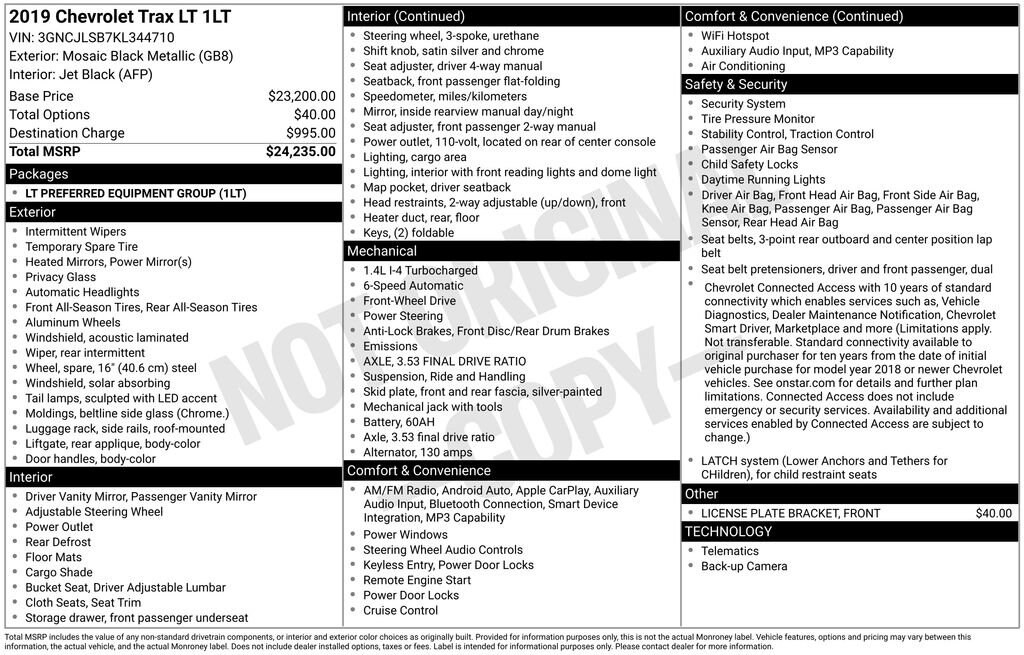 Boasting a sleek black exterior and a well-appointed interior, the 2019 Chevrolet Trax LT is the perfect companion for your everyday adventures. With its ECOTEC 1.4L I4 SMPI DOHC Turbocharged VVT engine and 6-speed automatic transmission, this compact SUV delivers an impressive blend of power and efficiency, achieving an EPA-estimated 26 city/31 highway MPG.